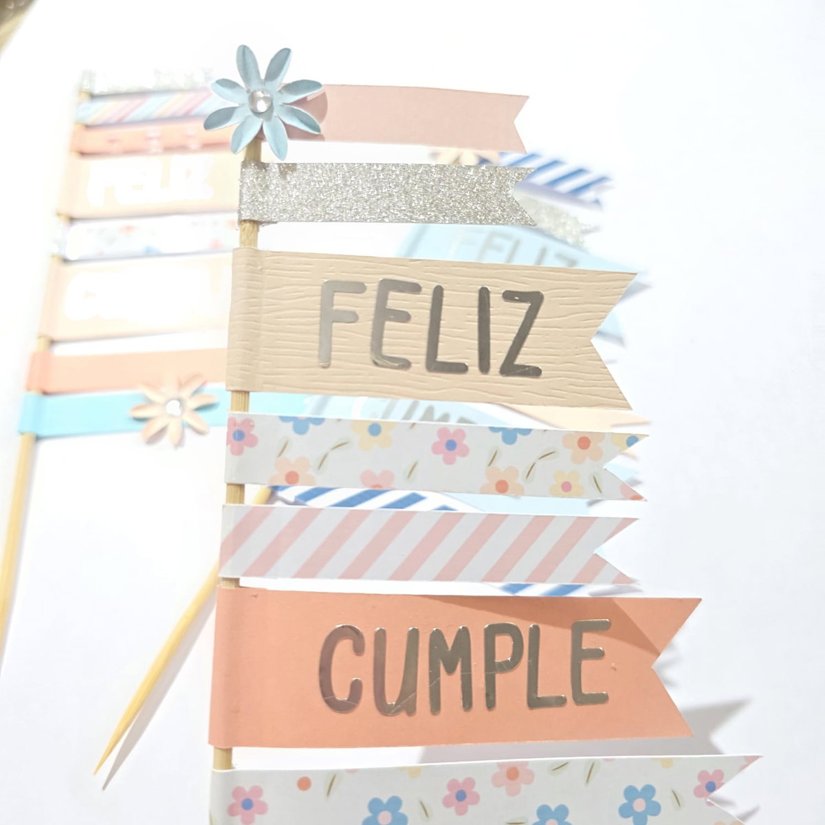 Toppers de papel, con detalle troquelados (flores). Variedad de combinaciones de colores. mix de banderitas combinando diseños y texturas de distintos papeles. Pequeños detalle de aplique de flores simples. Variedad de diseños y colores