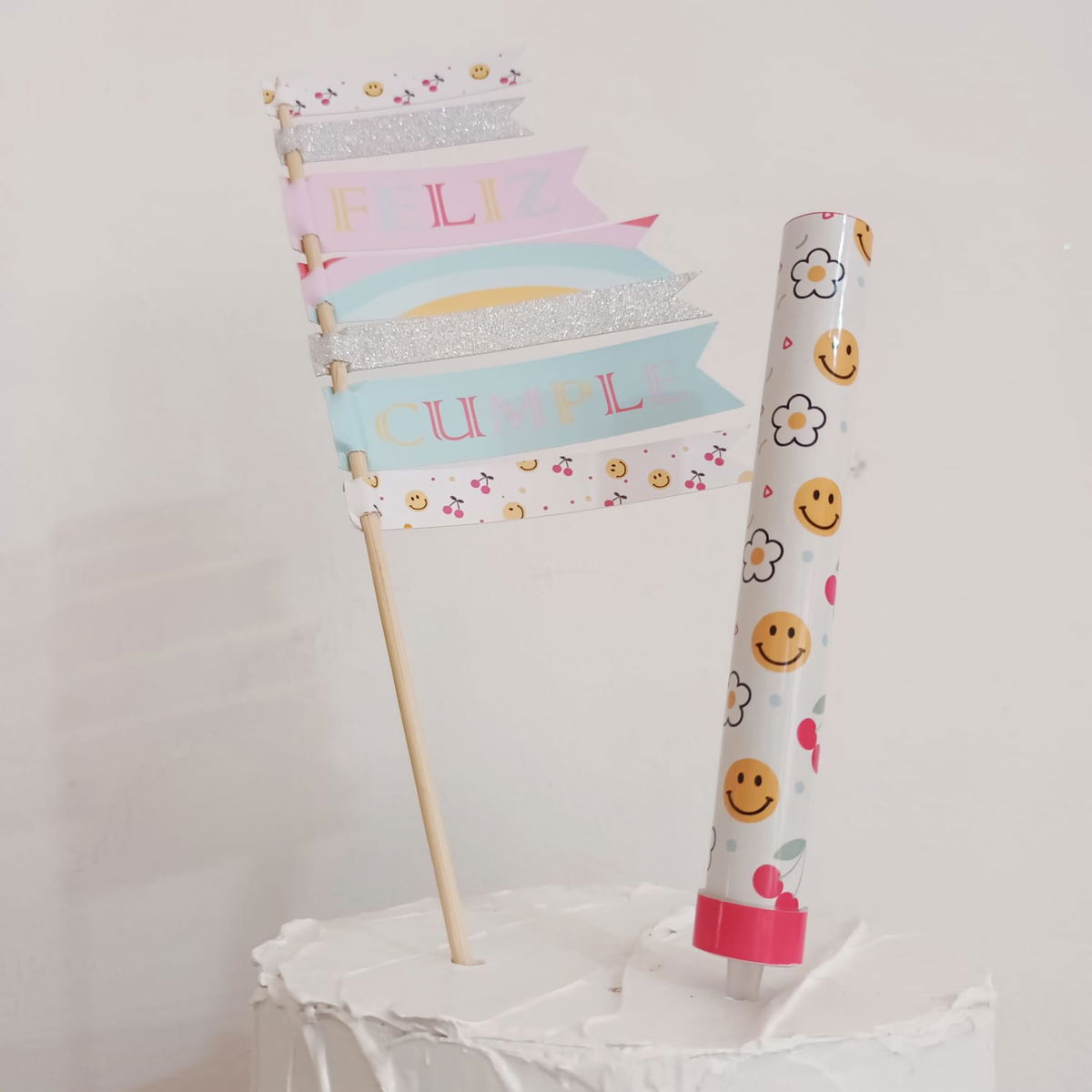 El set incluye 1 cake topper de papel y bengala forrada, son complemento perfecto para nuestro Kit Toppers de Polyfan.
