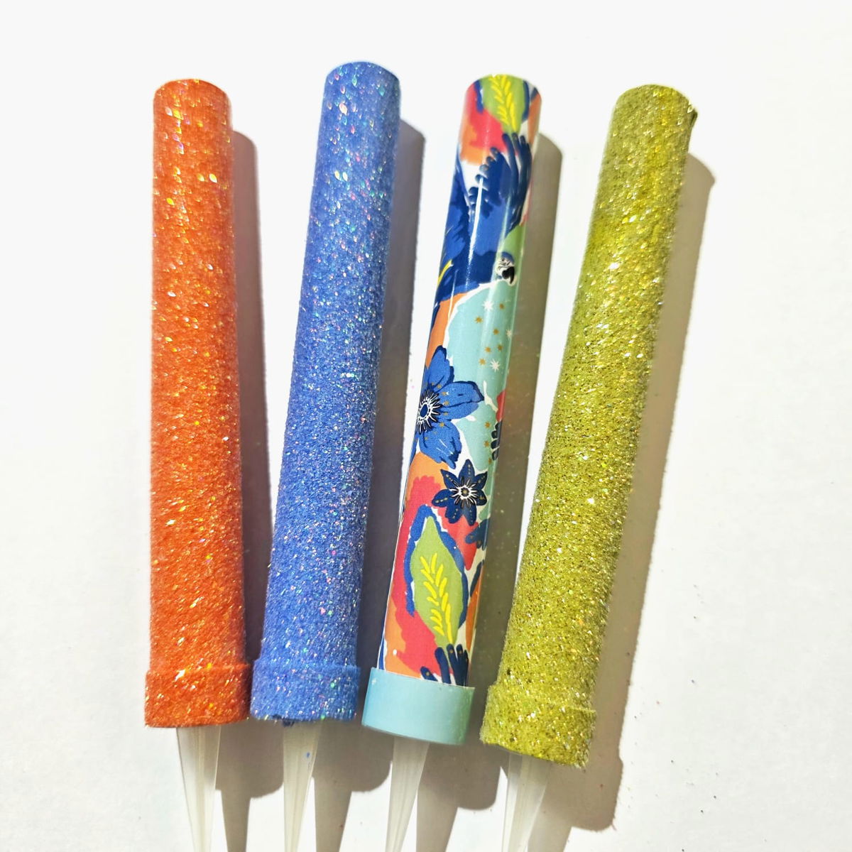 Set de bengalas compuesto por 1 bengalas de Diseño Tropical de papel, 1 bengala gibreada Pistacho, 1 bengala gibreada Azulino y 1 bengala gibreada Naranja